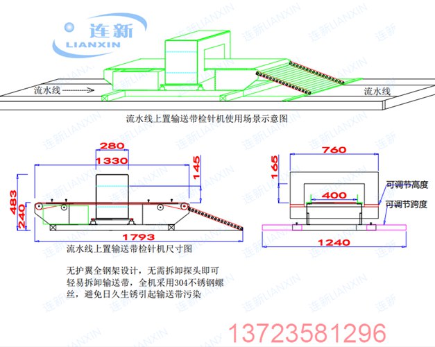 這是一款專門為流水線生產(chǎn)設(shè)計制作的輸送帶式檢針機,可直接放置在流水線上使用進行檢針驗針作業(yè),不需要改造流水線就可以加裝檢針機,也不需要占用通道擺放檢針機,節(jié)省使用空間節(jié)省檢針時間和效率。