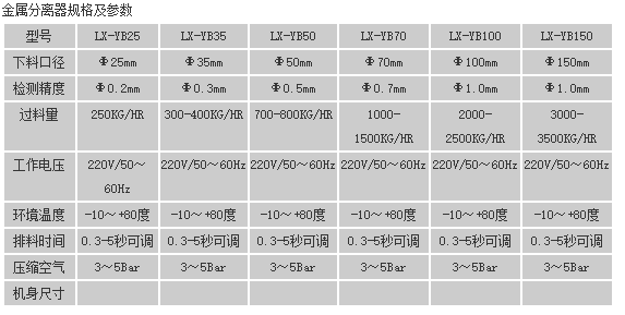 原料從料斗或送料器自由下落進入金屬分離器,如果沒有金屬雜質(zhì),原料會直接通過金屬分離器流向下端的出料口。如果檢測器檢測到原料中含有金屬,那么控制器立刻啟動分離板將金屬物和部分原料一起導(dǎo)向側(cè)面的排料口,然后分流板迅速恢復(fù)至正常的位置,分流板速度可調(diào),金屬分離器的檢測精度也可根據(jù)生產(chǎn)需要調(diào)節(jié),最小可檢測并分離出Φ 0.2mm的金屬顆粒。