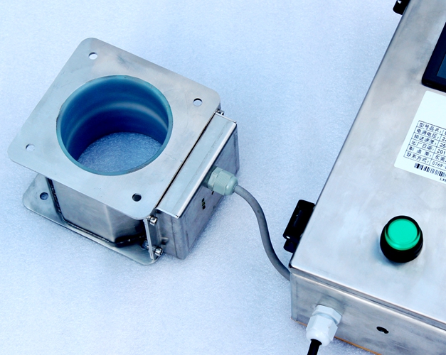 原料從料斗或送料器自由下落進(jìn)入金屬分離器,如果沒有金屬雜質(zhì),原料會直接通過金屬分離器流向下端的出料口。如果檢測器檢測到原料中含有金屬,那么控制器立刻啟動分離板將金屬物和部分原料一起導(dǎo)向側(cè)面的排料口,然后分流板迅速恢復(fù)至正常的位置,分流板速度可調(diào),金屬分離器的檢測精度也可根據(jù)生產(chǎn)需要調(diào)節(jié),最小可檢測并分離出Φ 0.2mm的金屬顆粒。